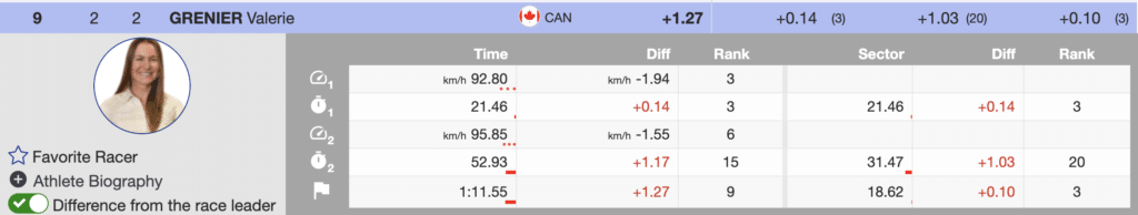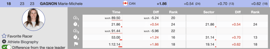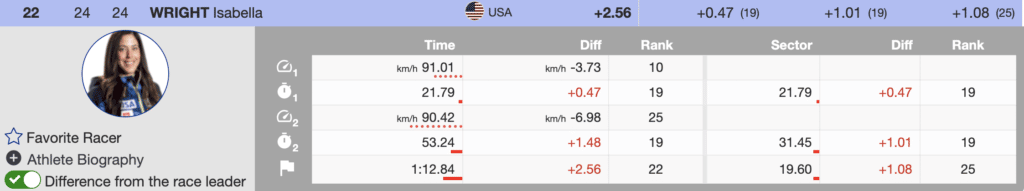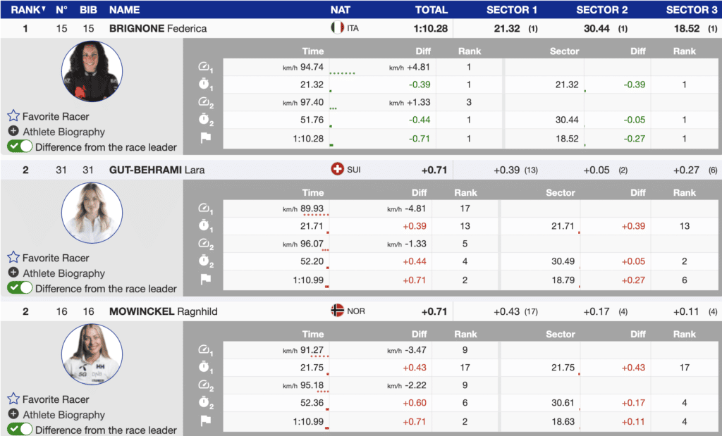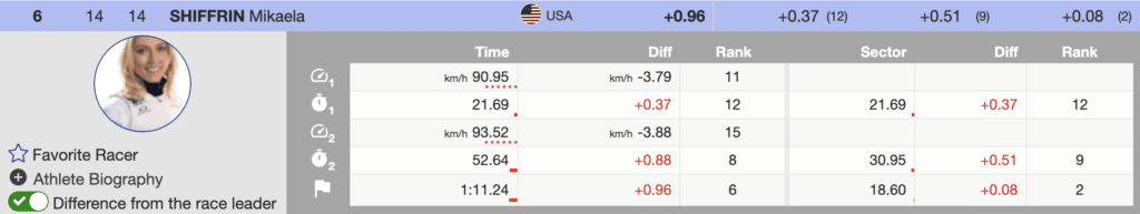 The prerace favorite is Mikaela Shiffrin. Shiffrin skied smoothly and tactically well. However, Shiffrin’s first run ranks sixth (+0.96) behind Birgnone. However, if the German coach’s final run course is challenging, the differential is manageable for the best slalom skier in women’s history.