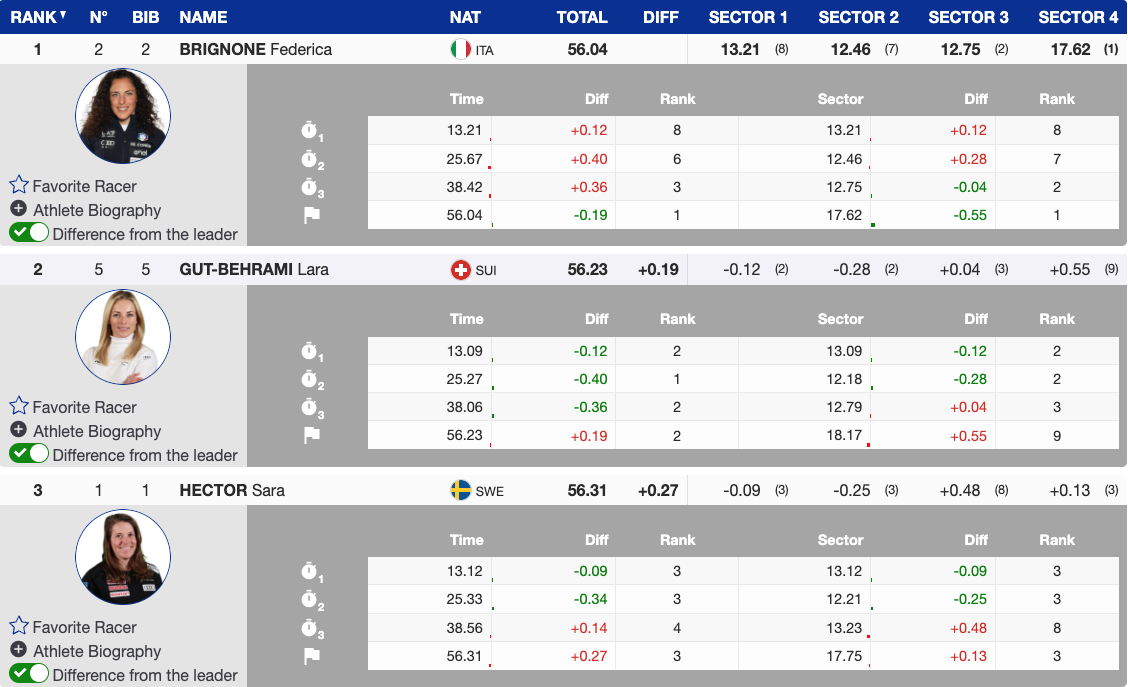 At the end of the first run, Brignone held her 0.19-second lead over Gut-Behrami, with Hector in third, 0.27 seconds back. Seven skiers were within a second of the leader, setting the stage for a thrilling second run.