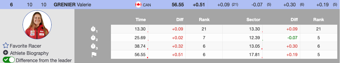 Canada’s Valérie Grenier, wearing bib 10, delivered a strong run, finishing sixth fastest in the morning.