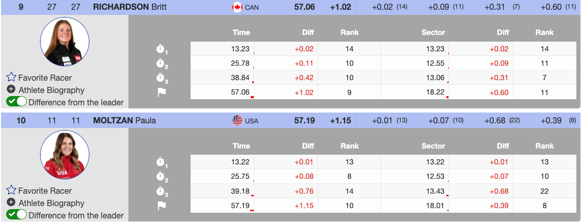 The standout North American performance came from Canada’s Britt Richardson. The 21-year-old skied brilliantly, finishing just 1.02 seconds back to claim ninth place.