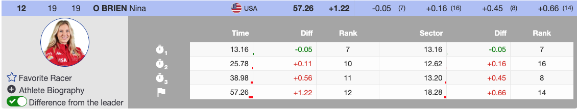Nina O’Brien delivered a solid performance for the U.S. team, skiing into 12th place with a time 1.22 seconds off the leader.