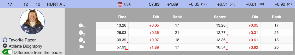 AJ Hurt, starting with bib 12, skied consistently but lacked the pace of the leaders. She finished 1.89 seconds back, placing 17th after the first run.