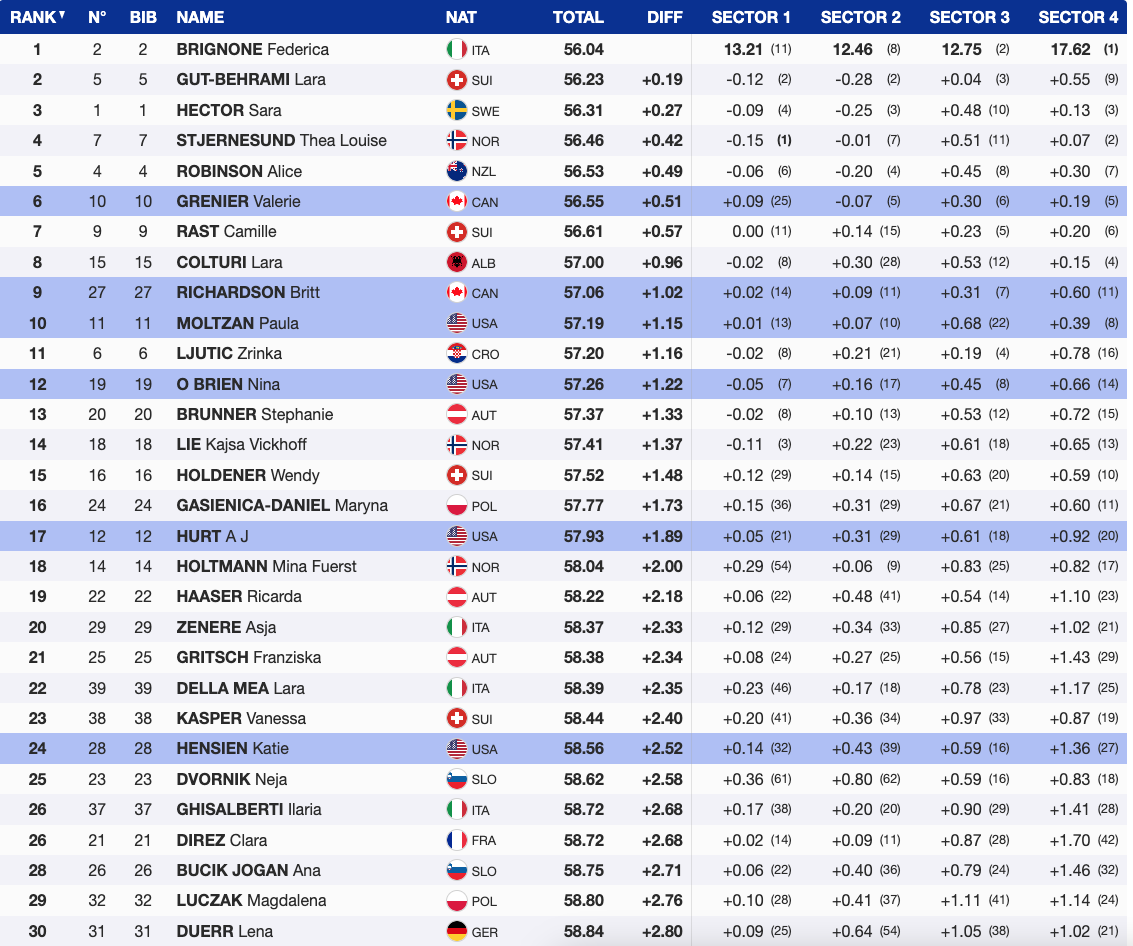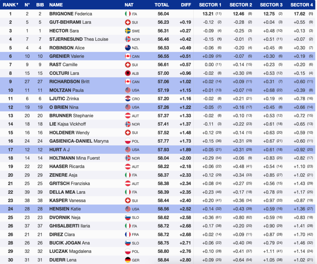 The North Americans showed promise, with Grenier, Richardson, Moltzan and O’Brien positioning themselves for strong second-run performances. Brignone leads a tightly packed field into the finale, where seven skiers are within a second, promising an exciting finish on one of the season’s toughest GS tracks.