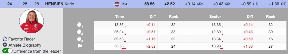 Katie Hensien was the final U.S. skier to qualify, finishing 24th. This marks her fifth consecutive GS qualification after returning from injury.
