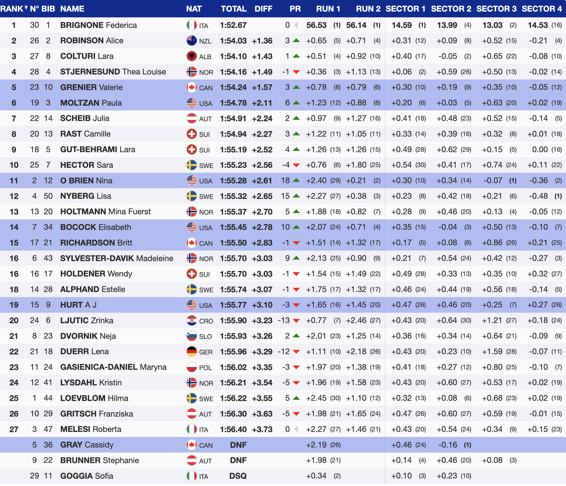 - Federica Brignone (ITA) – 1:52.67 (17th career GS win, 5th this season)