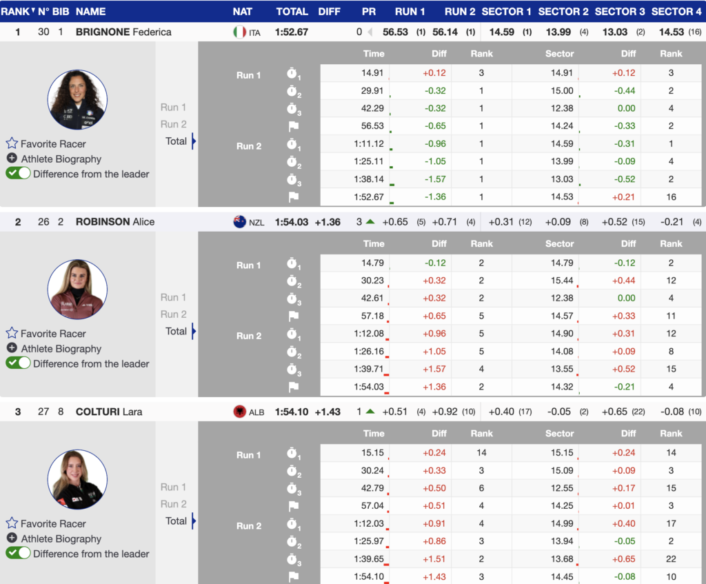 Brignone delivered the performance expected of her, crushing the course and winning by a massive 1.36 seconds. Her dominant run sealed the final podium standings, keeping Robinson in second place and Colturi in third place.