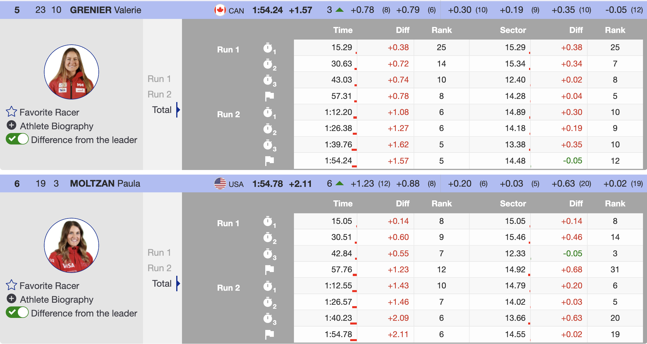 Next came Valérie Grenier (CAN), the fastest North American from the first run and a two-time World Cup giant slalom winner. Grenier skied with power and confidence, making up time in the second half of the course. When she crossed the line, she took the lead by 0.54 seconds, dethroning Moltzan.