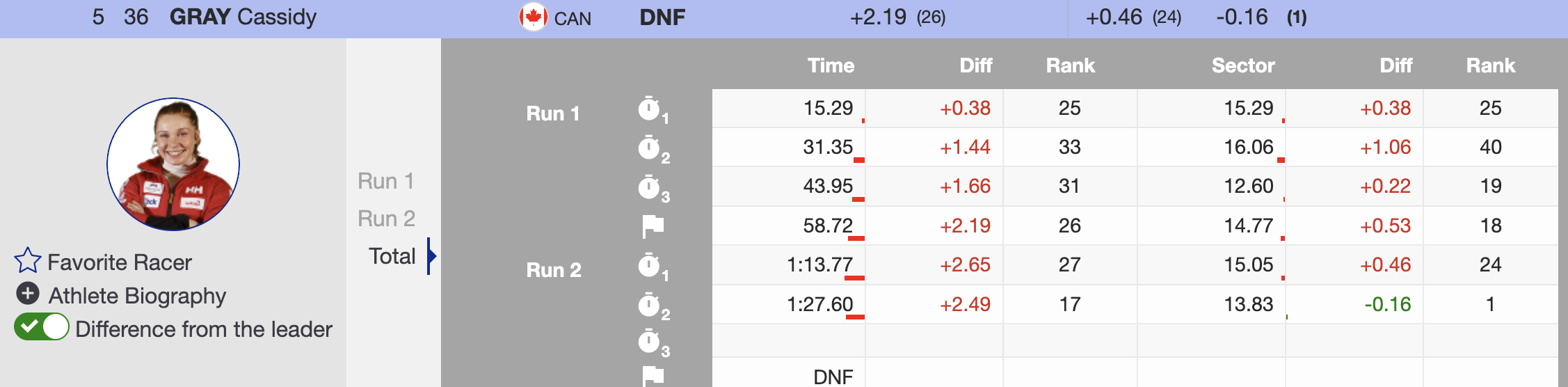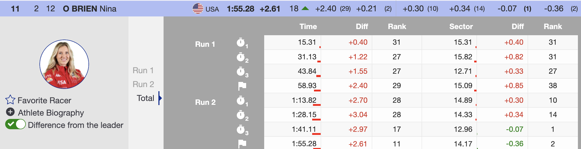 O’Brien, who had started second after a disappointing first run, had already jumped eight spots in the standings—an expected turnaround for a skier of her caliber. Behind her, Lisa Nyberg (SWE) and Elisabeth Bocock (USA) had also climbed the ranks, sitting second (+0.04) and third (+0.17), respectively.