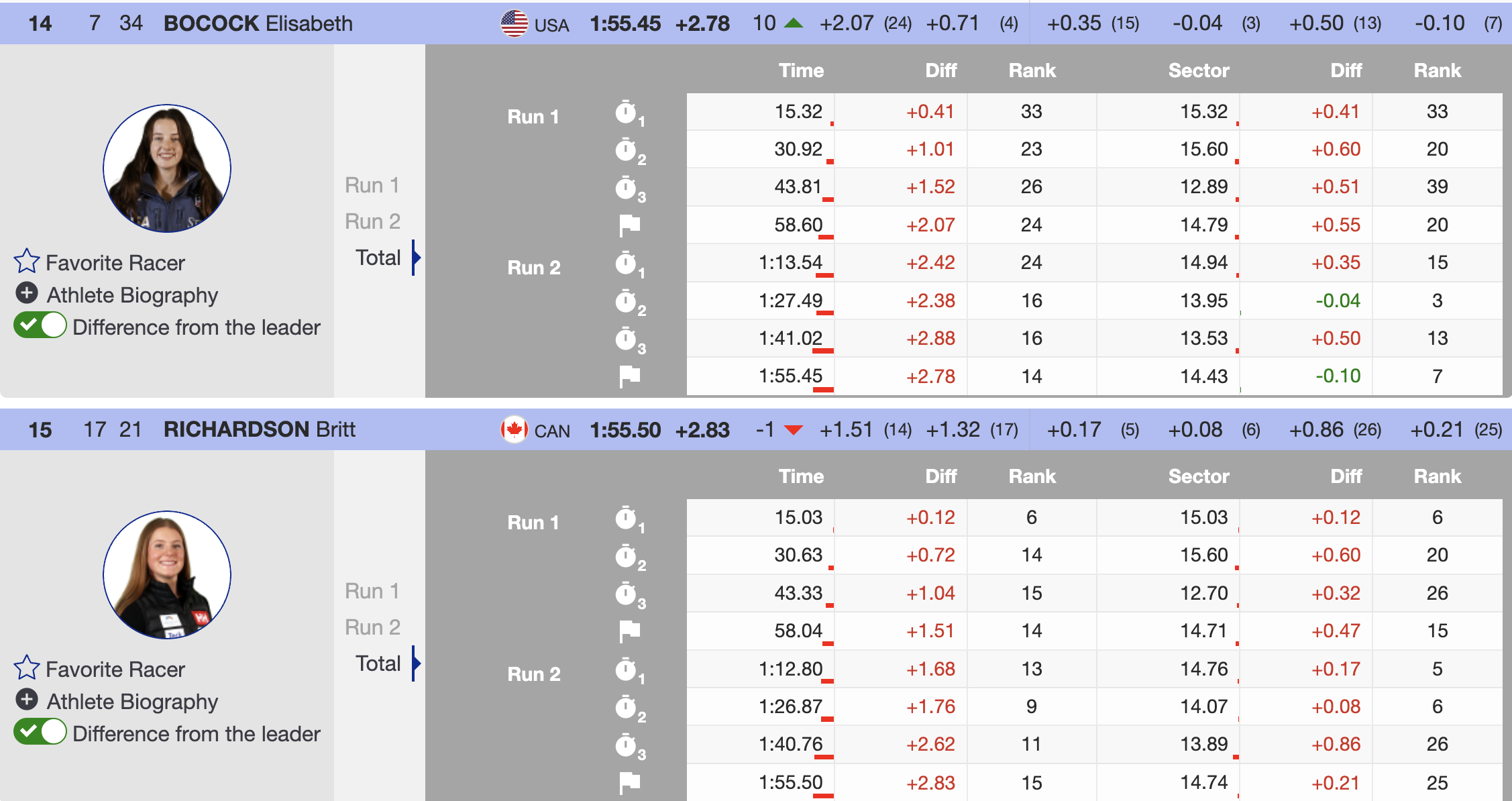 - Britt Richardson (CAN): Moved down one spot, finishing 15th.