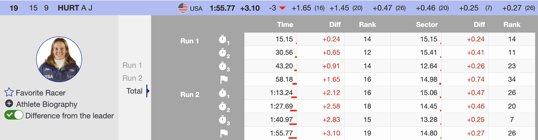 - AJ Hurt (USA): Slipped three places in the second run, finishing 19th.