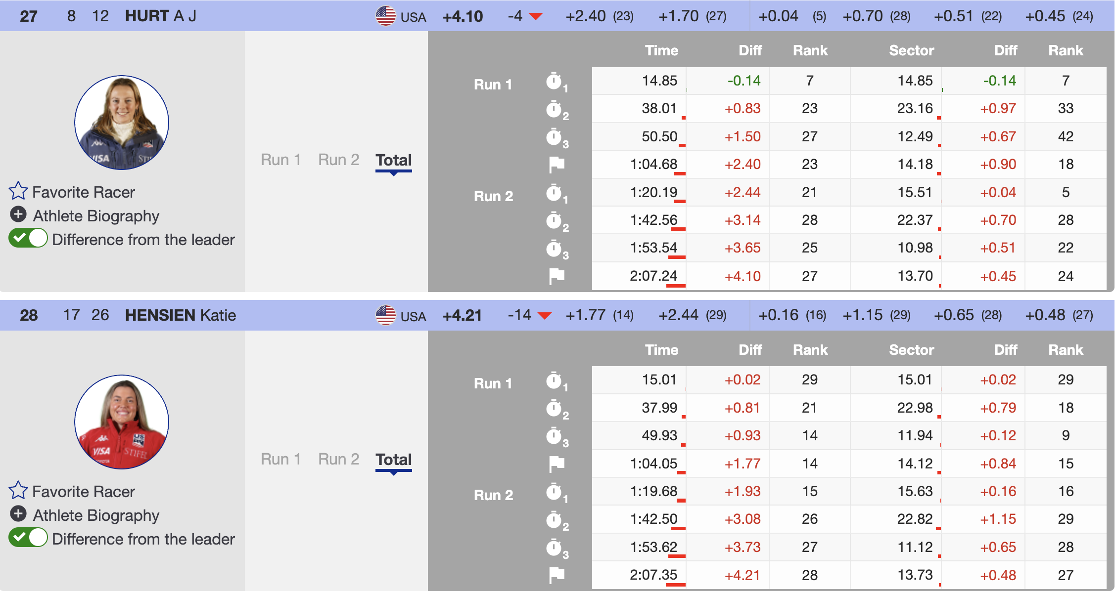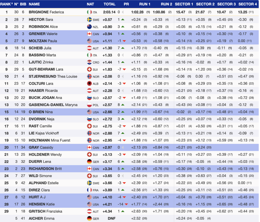 All seven North Americans completed the race, showcasing their depth and determination. Grenier led the group, finishing just off the podium in 4th. Moltzan followed closely in 5th, while O’Brien secured 15th. Gray placed 20th, with Richardson finishing 23rd. Hurt, in her first race of the season, claimed 27th. Hensien struggled with grip during her second run and couldn’t find her rhythm, falling 14 spots to 28th, but she is having a great GS season.