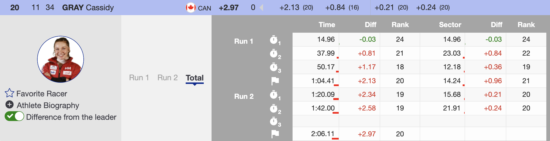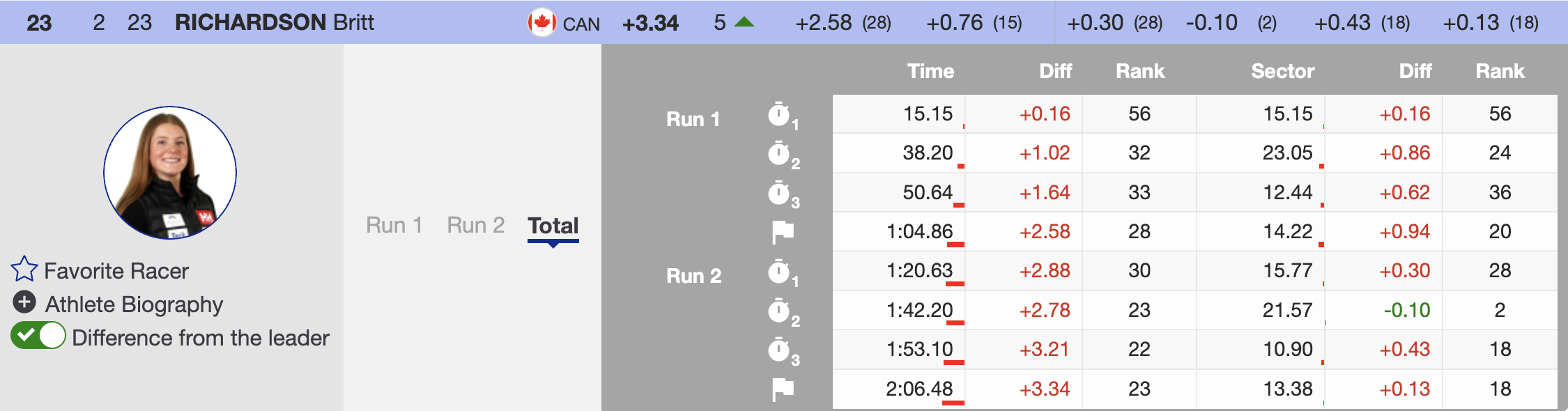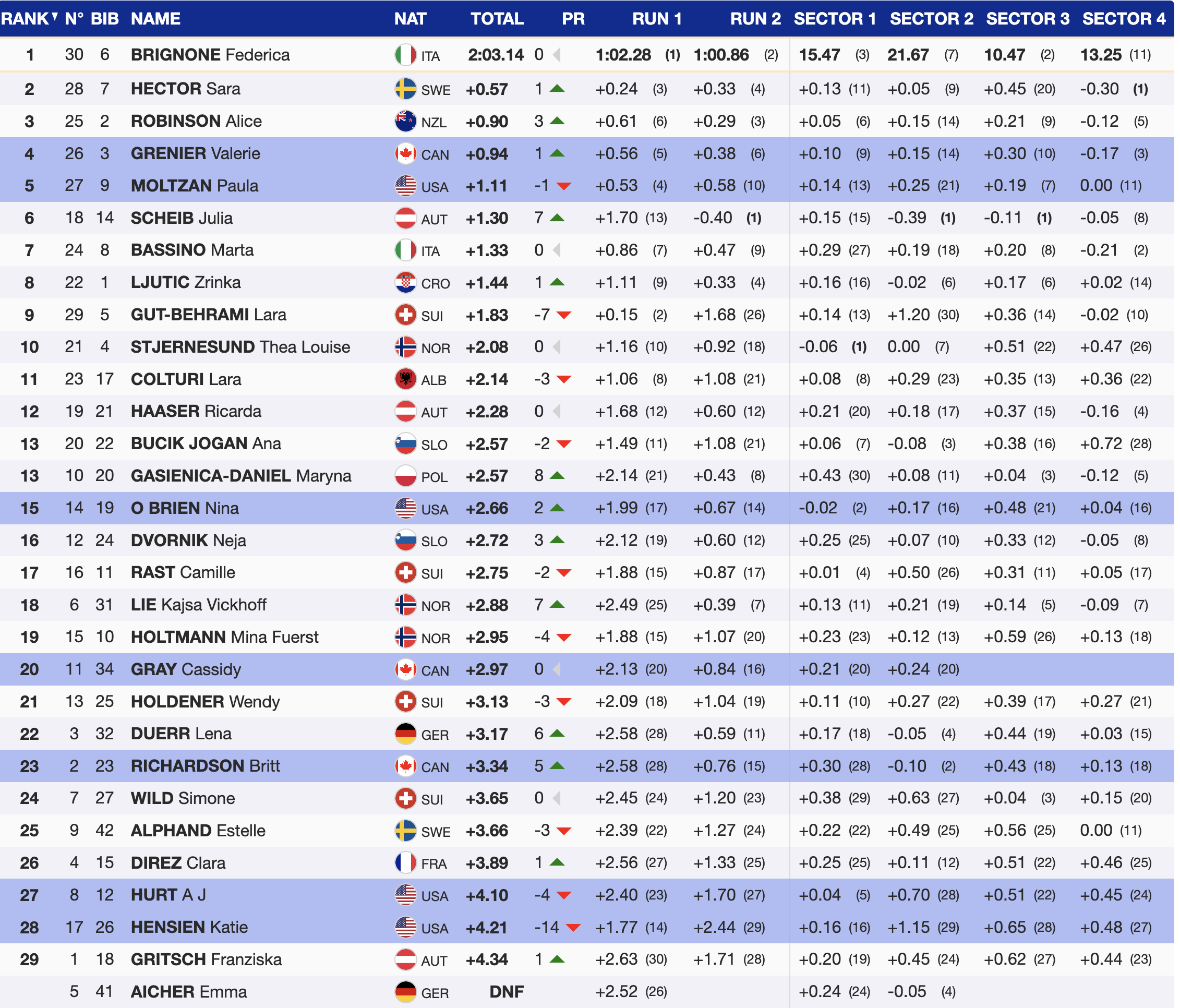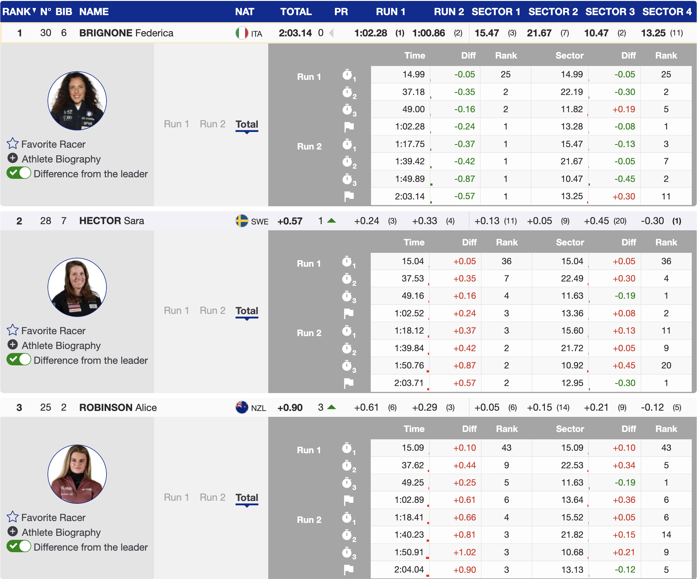 Switzerland’s Lara Gut-Behrami, the reigning World Cup GS champion, was the next to challenge the leader’s time. Despite her aggressive approach, she struggled to find her rhythm on the demanding Panorama slope and finished well off the pace, ninth. Her result secured Robinson a spot on the podium, leaving only Italy’s Federica Brignone at the start, ready to defend her first-run lead.