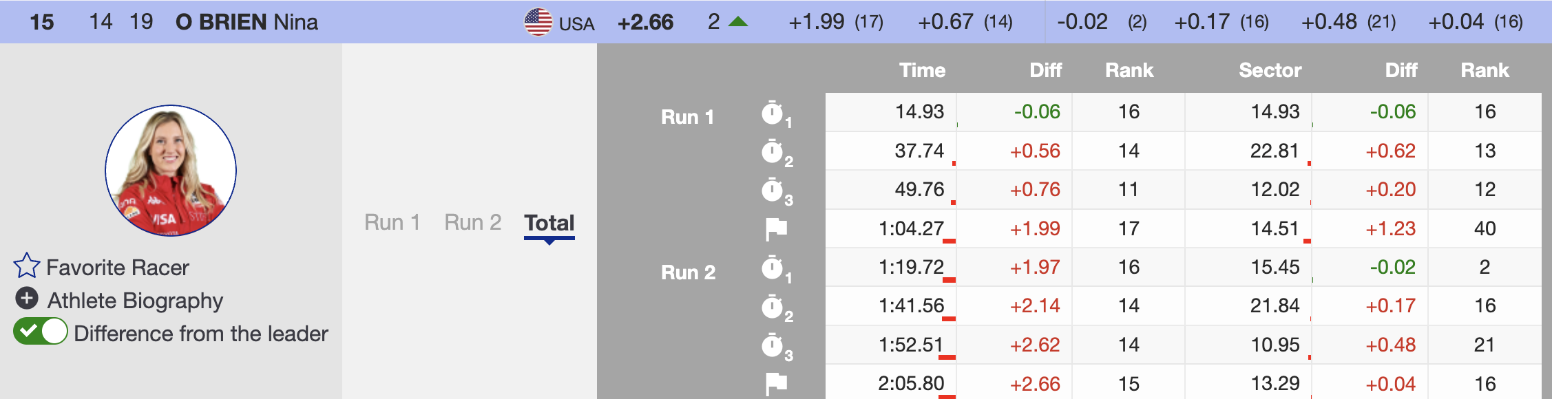 After the first half of the field had raced, Poland’s Maryna Gasienica-Daniel remained in the lead. However, her margin narrowed as Stifel U.S. Ski Team’s Nina O’Brien delivered an impressive run, moving into second place just 0.09 seconds behind. With 15 more skiers still to race, the competition was far from over.