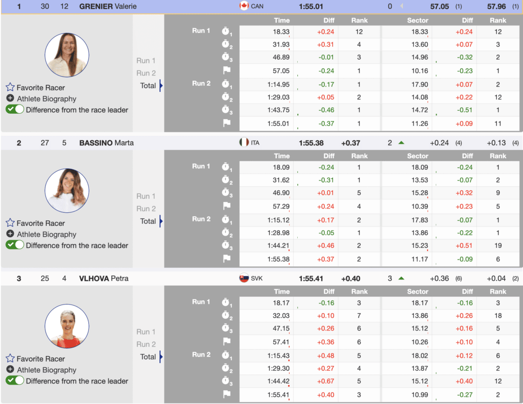 The second run excitement accelerated when Vlhova, tired of not winning, crossed with a 0.93 lead. She skied well at the top of the course but then found additional speed at the bottom. She stayed ahead of the next skier, Mikaela Shiffrin, who crossed tied for second. However, Vlhova did not beat the next racer, World Cup GS leader Marta Bassino. Bassino, who finished only 0.03 of a second ahead of Vlhova, was then the leader. Bossino then watched fellow Italian Federica Brignone threaten the lead all the way through the final split before falling behind to cross into third. The leaders then watched as Switzerland’s Lara Gut-Behrami, 2nd after the first run, crossed in 4th. However, they all witnessed the improbable as the Canadian Grenier left no doubt she was today’s best by winning both runs and the race.