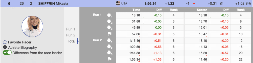 After the race, Shiffrin stated, “I felt like my skiing was quite good. But there’s a difference between good skiing and then the fastest skiing. So we’ll look at the video and see what I can adjust. If I can adjust something, I’ll try it tomorrow. It is usually five or six turns. It can make that big of a difference. So it is probably a minor adjustment.”
