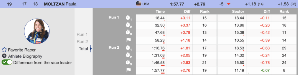 The first North American to ski the second run was USA’s Paula Moltzan. Even though she didn’t cross with the lead, a happy Moltzan said hello to her father through the TV camera before exiting the finish. Moltzan ends the race 19th.