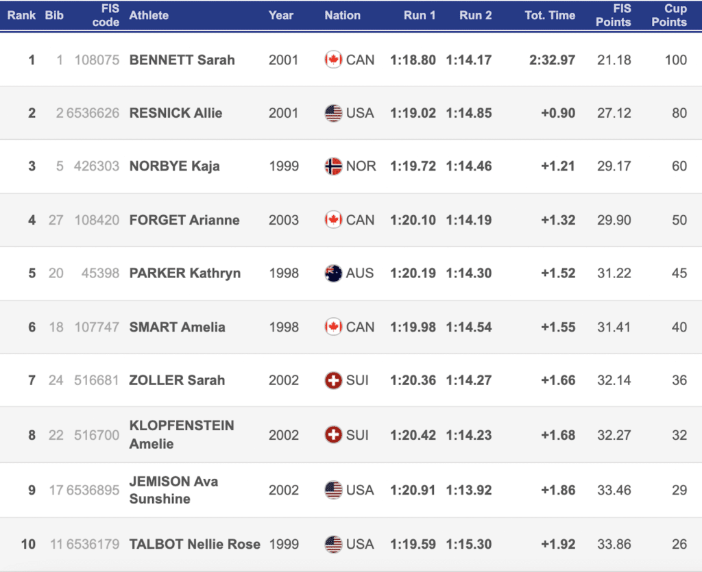 Canadian Sarah Bennet finished with a total time of 2:32.97 to win the final women’s GS in Panorama, 0.90 seconds ahead of American Allie Resnick. Bennett was the only Canadian in the top 10 today, it was also her first NorAm podium.