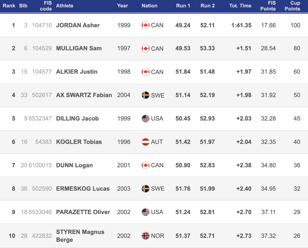 After not getting a single man on the podium yesterday, the Canadians swept at the men’s slalom podium today. Asher Jordan finished in first by 1.51 seconds, with Sam Mulligan and Justin Alkier rounding out the podium in second and third.