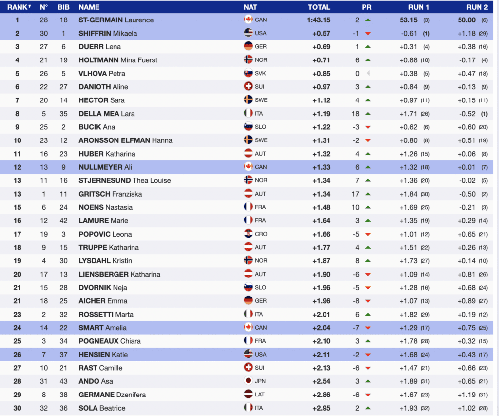 Méribel, France – Few, if any, thought bib 18, Canadian Laurence St-Germain would finish the first run 3rd and end the day with a victory. However, St-Germain is the women’s 2023 slalom world champion.