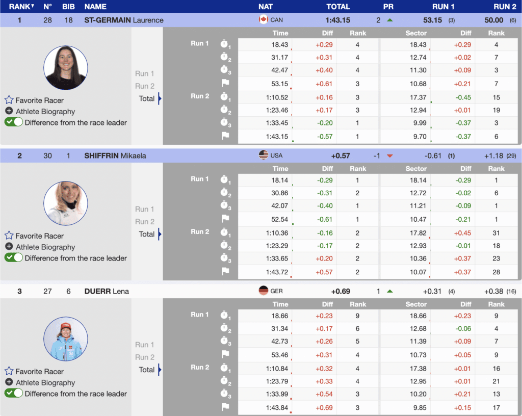 The medal fight began with five women left to ski. Petra Vlhova, 5th (+.0.99) after the first run, was the first to challenge. But Vlhova crossed into second. Duerr was the next to ski and while she lost most of her advantage, she finished with a slight (-0.02) lead. However, Canadian Laurence St-Germain continued to ski at an exceptional level and struck with a significant (-0.69) lead and a guaranteed medal. And when Switzerlands Wendy Holdener straddled and did not finish, St-Germain had earned a minimum of silver. However, silver turned to gold when during the final run, Shiffrin skied below her amazing standard and finished 2nd.