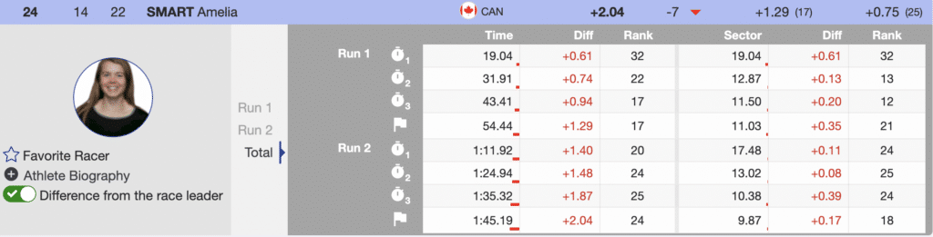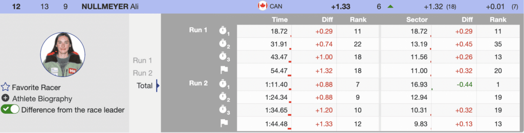 Ali Nullmeyer was the first of the Canadians to ski. While she could not cross with the lead, she skied well and moved up the leaderboard. Nullmeyer finished 12th. Finishing inside the top 15, she will score valuable World Cup Start List points. Unfortunately, her teammate Amelia Smart could not find speed in the more direct course and ended her championship in 24th place.