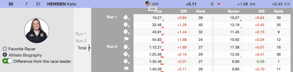 Hensien shared her thoughts after the race, “I was really happy about my first run, you know, some mistakes, but all in all, solid skiing. The second run wasn’t it for me, but I’m happy to take away two runs today. Plus, with my GS performance, I’m happy and taking the right steps forward and it’s showing, keep the momentum going into Are.”