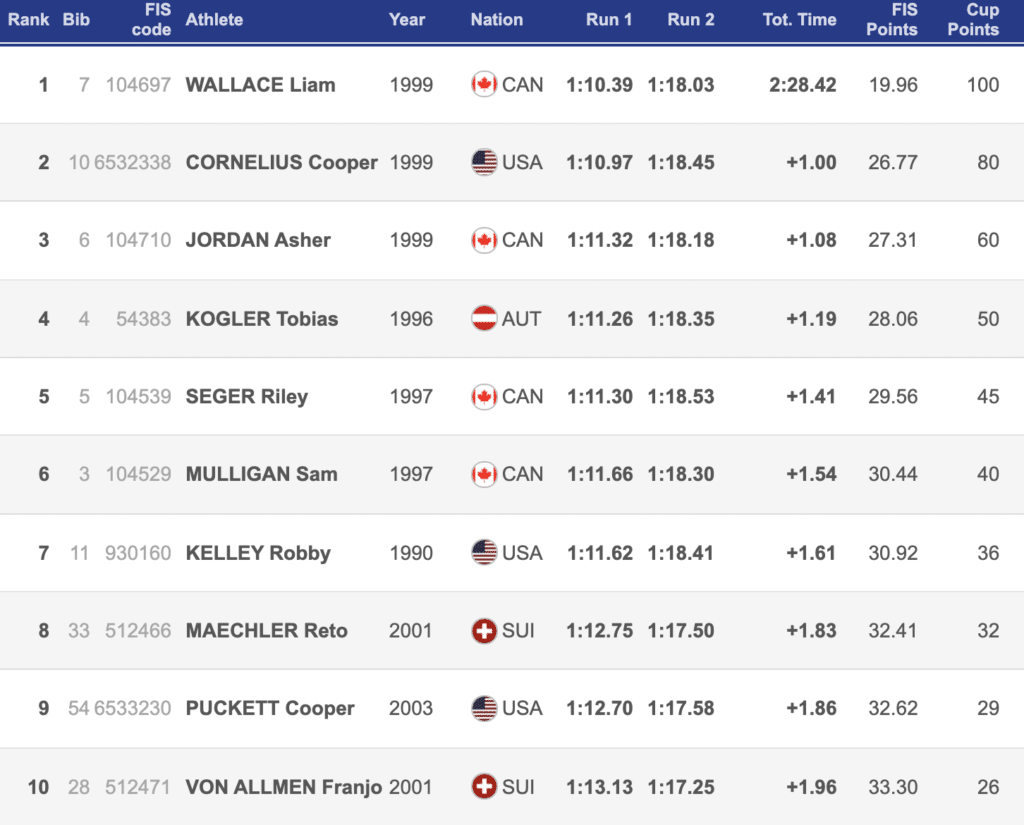 Liam Wallace and Asher Jordan finished in first and third in the men’s GS on Friday. Separating the Canadian teammates was American Cooper Cornelius, who finished in second place. Wallace won the race by one second, just .01 seconds more than Smart won the women’s race today.