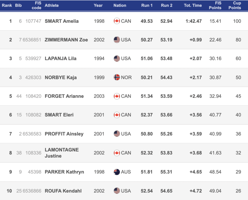 Amelia Smart won the first women’s slalom in Panorama Friday for her fifth career NorAm slalom win. Joining her on the podium were Americans Zoe Zimmerman and Lila Lapanja, who were 0.99 and 2.07 seconds off the pace, respectively. Zimmerman and Smart both recently raced the Killington World Cup slalom.