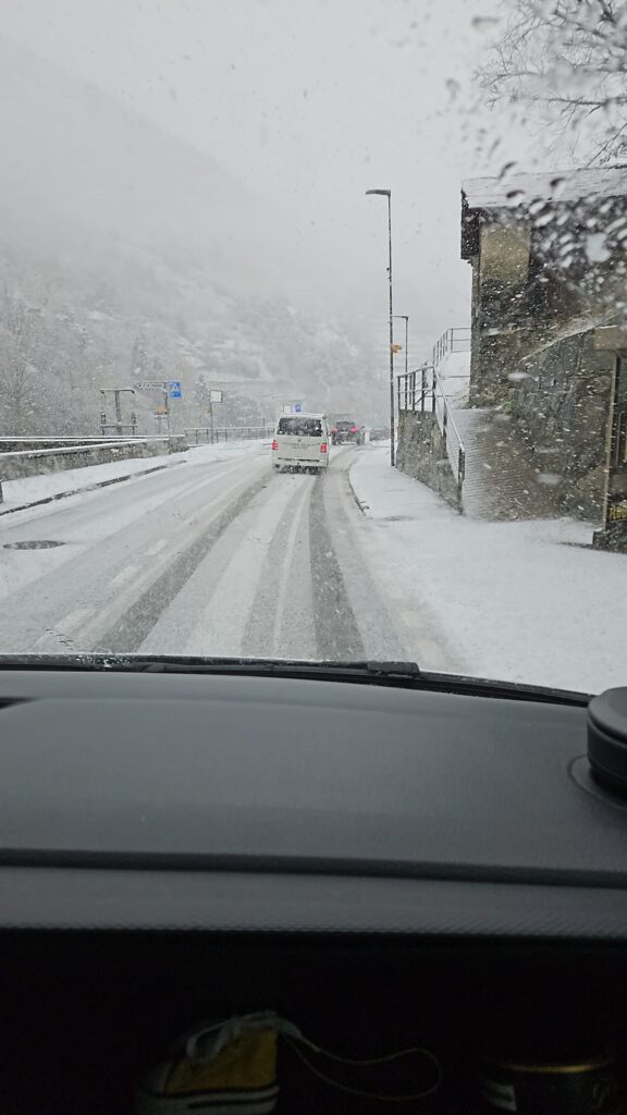 A line of cars as the World Cup Teams drive out of Zermatt after the cancellation.