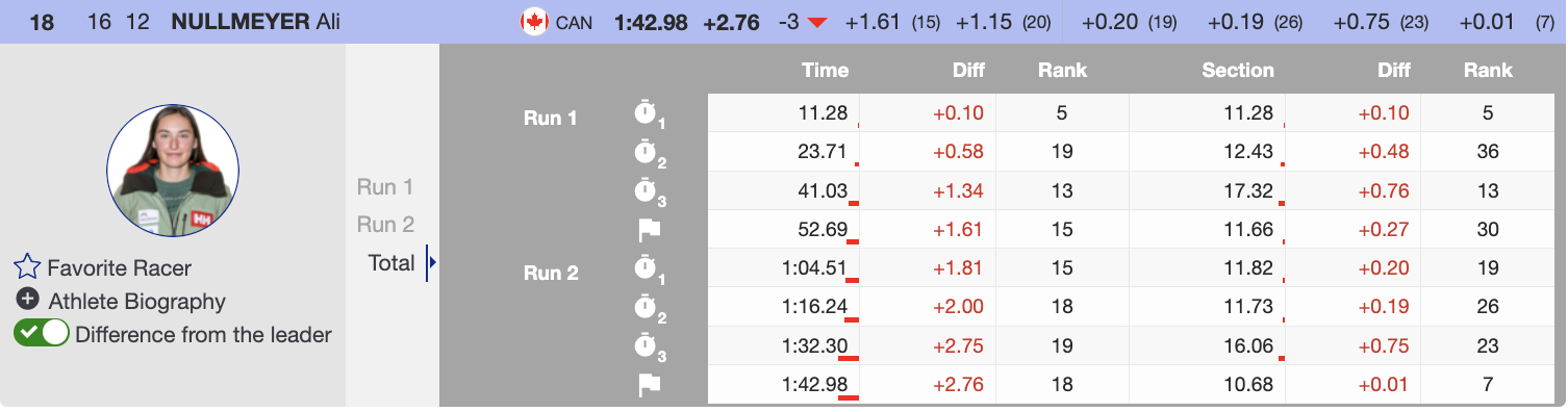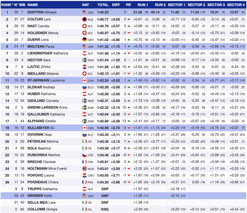 Alpine Canada Alpin’s Ali Nullmeyer was the first North American to start the second run. Last season, she achieved 4 top-10 finishes. However, she started this season in Levi with a DNF. Therefore, she was ready to redeem herself and put down a solid two runs.