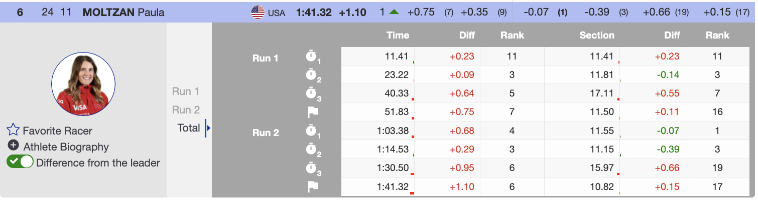 She ignited out of the start but got jostled into the backseat slightly at the top of the pitch, which caused her to over ski. She ended successfully, finishing two respectable runs, achieving 18th place.