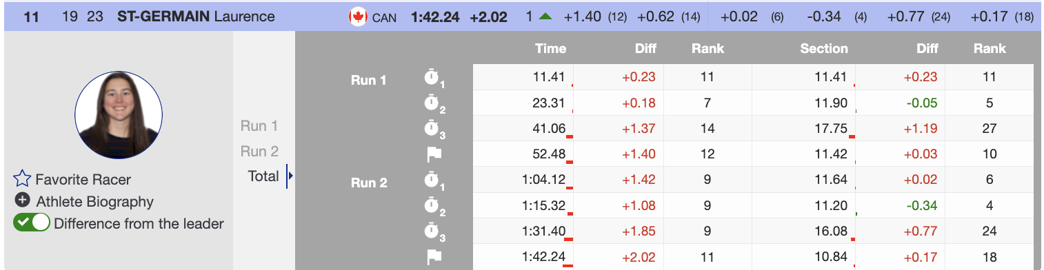 Her teammate, Laurence St-Germain, took advantage of the top section and came into the pitch with a substantial lead. She skied the pitch smart but lost time in the final part of the course. She ended the day in 11th place.