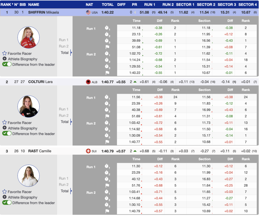 Lara Colturi from Albania had an incredible day on the slopes, showcasing seriously powerful skiing. She edged out Switzerland’s Camille Rast for the 2nd place spot by a mere 0.02 seconds. This is a historic moment as she’s the first Albanian to land on the podium, marking her first top-3 result.