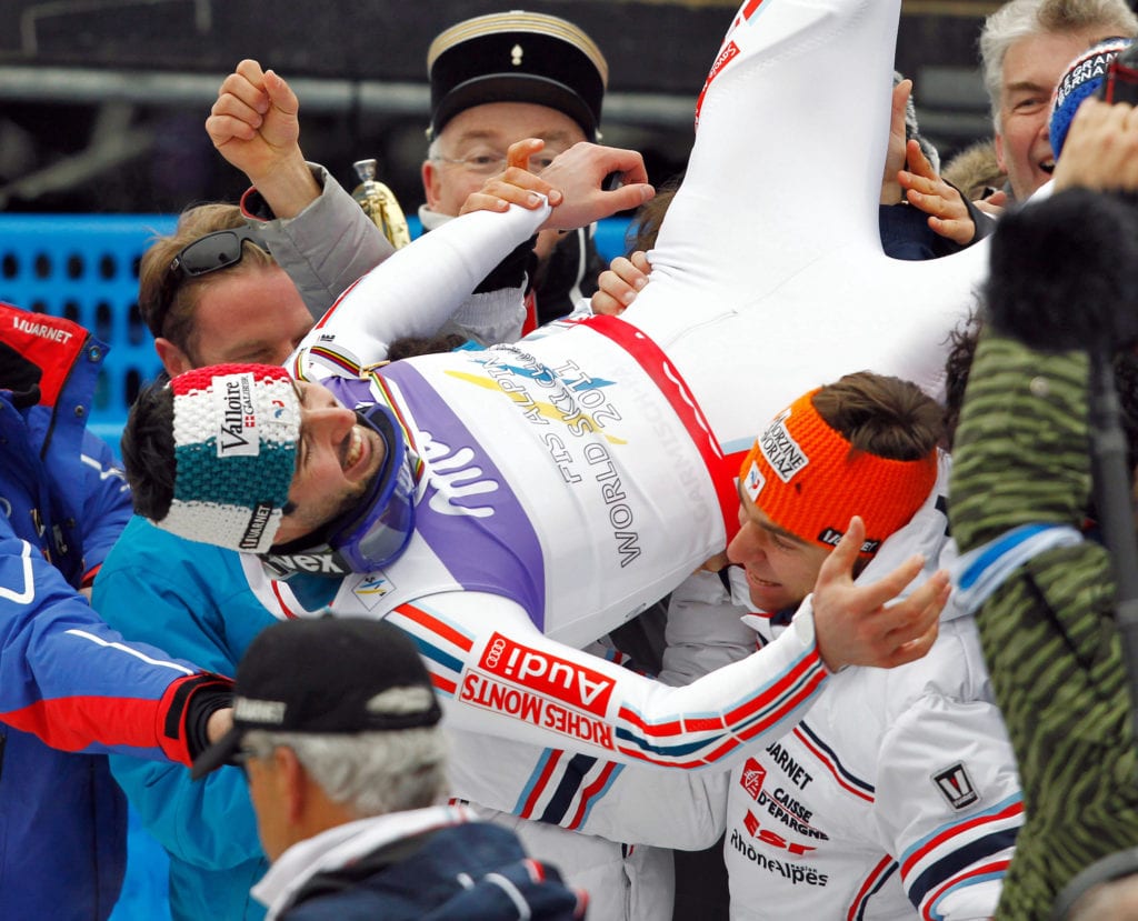 He went out in style, taking a second run victory lap – hugging coaches on the way down and skiing through a gauntlet of French coaches and staff as he crossed the finish, taking a final triumphant ride on the shoulders of his teammates. On the stadium video board, his mother, father and entire family watched from the family business in Valloire.