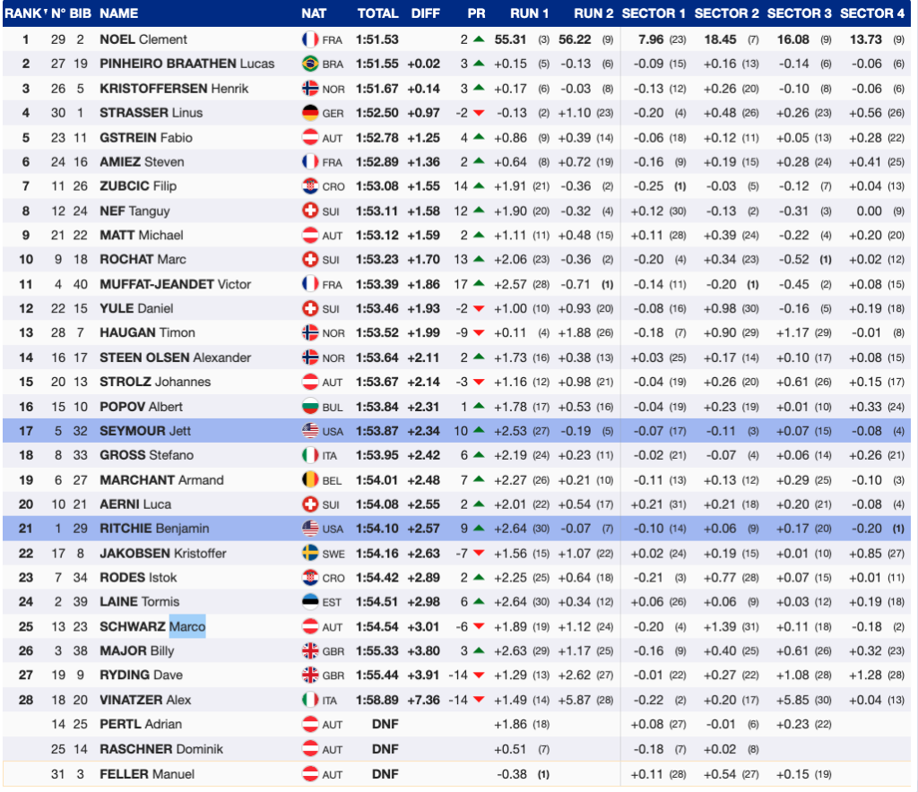 Ritchie skied a solid second run, unveiling strong tactical skiing on the steep pitch. He concluded the day in 21st place. This was his second top-30 result in Adelboden and his tenth in slalom.