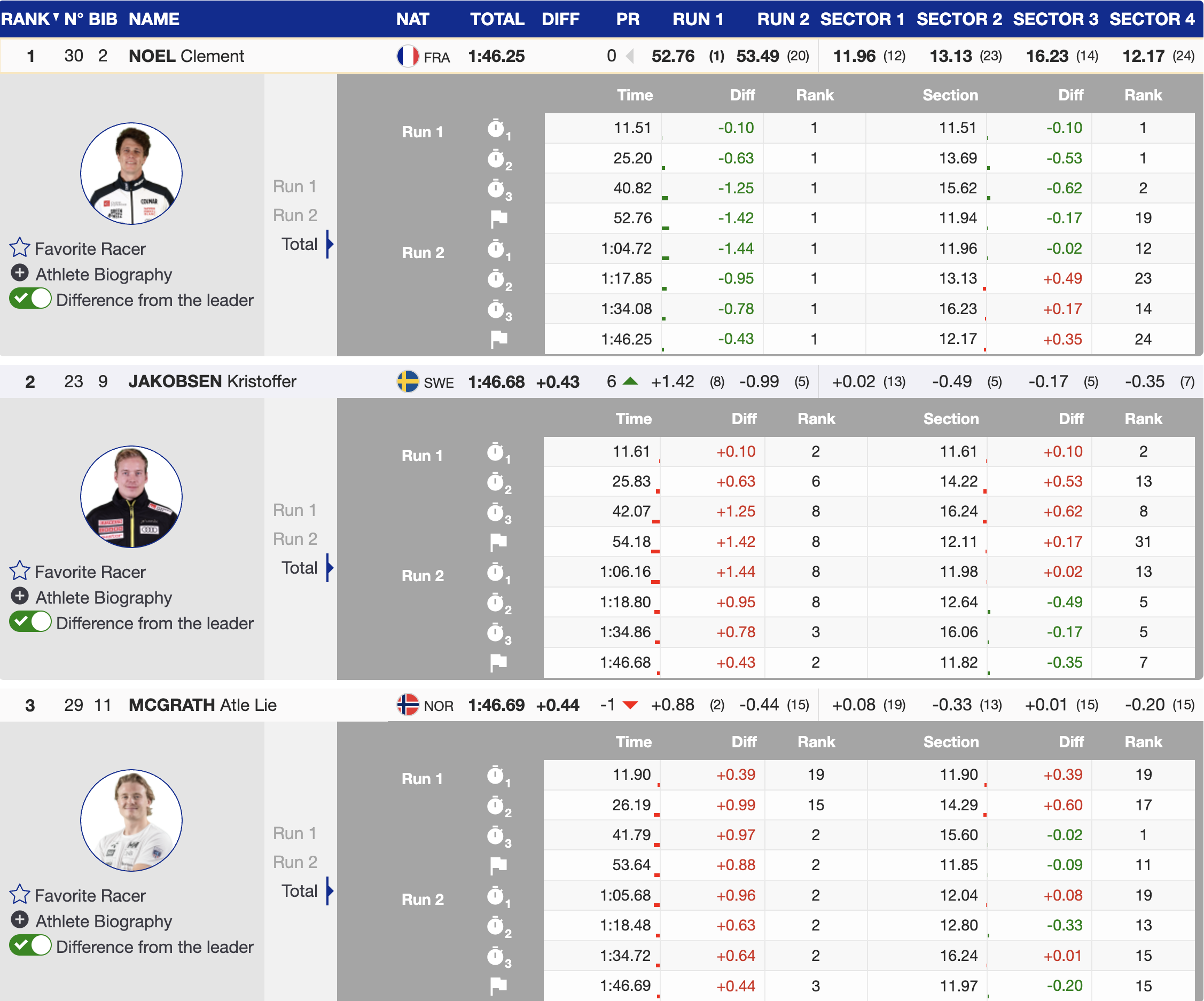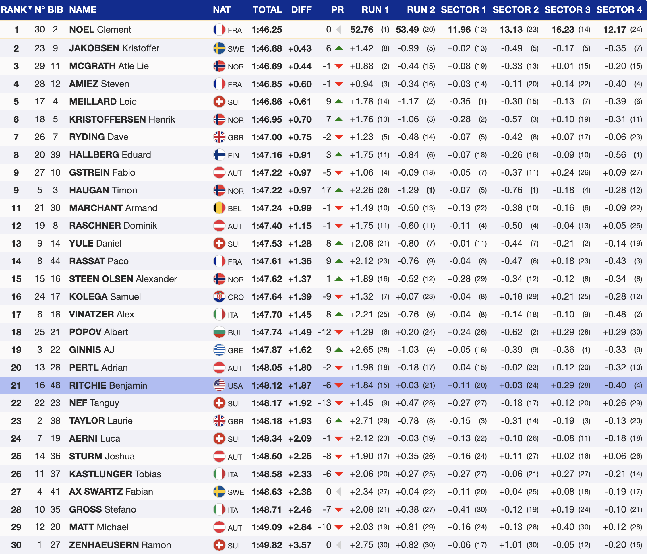 After the race, Noël reflected on his performance: “The feeling was not so good for everyone. It was a real battle in the second run. I was quite confident at the start, but then I had a really bad feeling. I tried to ski a little bit better in the steep and then I made another mistake at the bottom, so I was really not sure that it was going to be enough to win. But yeah, the most important is that I had a good margin in hand and then I was able to win the race. But for sure, that second run was a real fight.”