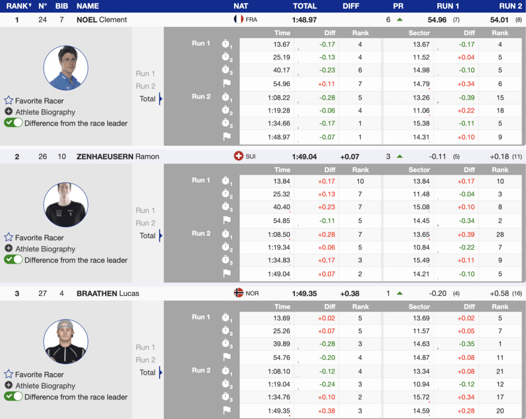 Racer after racer led on the course but then would make a significant mistake and fall behind. Swiss athlete Ramon Zenhaeusern came the closest. He finishes only (+0.07) off the top step. The current leader of the slalom standings, Lucas Braathen, skied immediately after Zenhaeusern and crossed in third, (+0.38) behind Noël.