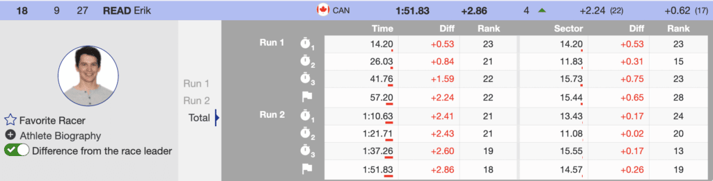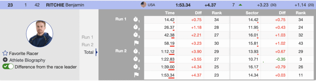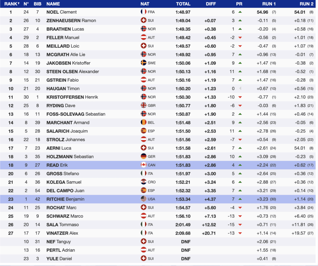 There were a considerable number of second-run struggles. Because of that, USA’s Benjamin Ritchie took advantage of the situation and moved up seven positions to 23rd. He scored for the second time this season. The fastest North American was Canadian Erik Read, who ended the day in 18th place. Read has now scored in six of the seven slaloms contested in 2022-23.