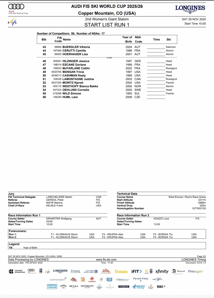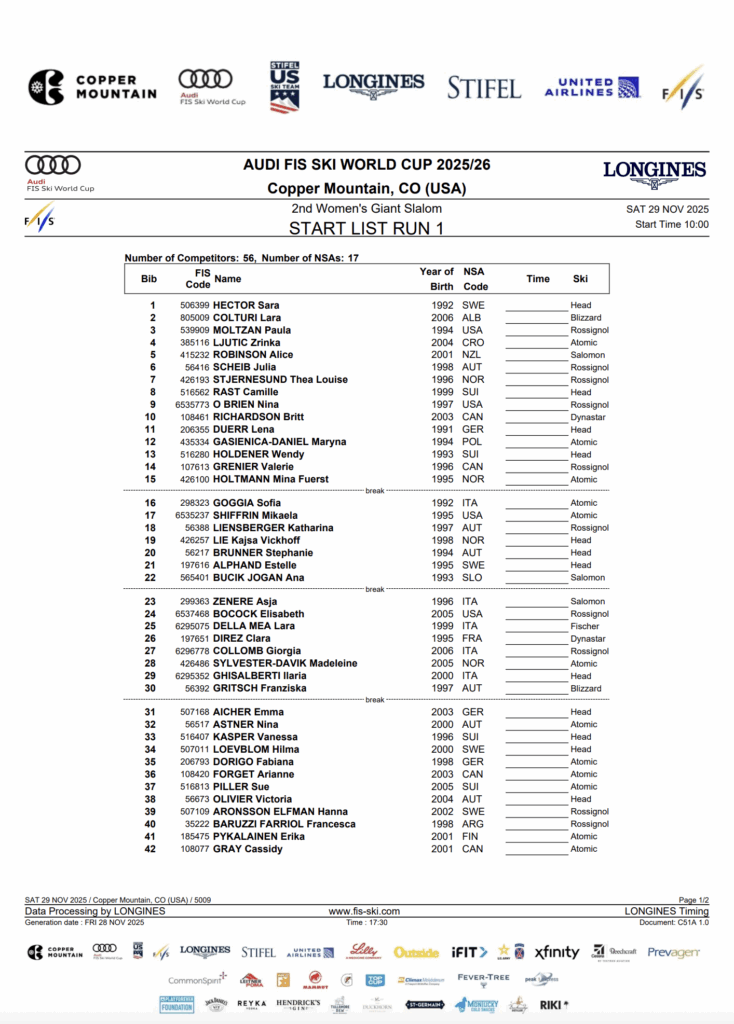 Start number, athlete, nation, bib, and partner ski brand when applicable.