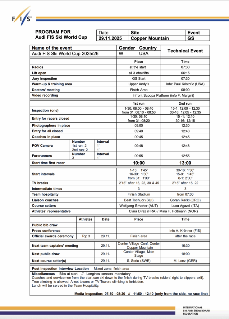 The women return to Copper Mountain on Saturday for the second giant slalom of the Stifel Copper Cup, bringing early-season intensity and a deep international field to Colorado. This guide provides the first-run start list along with focused point lists for the top seven starters and every North American athlete in the race.