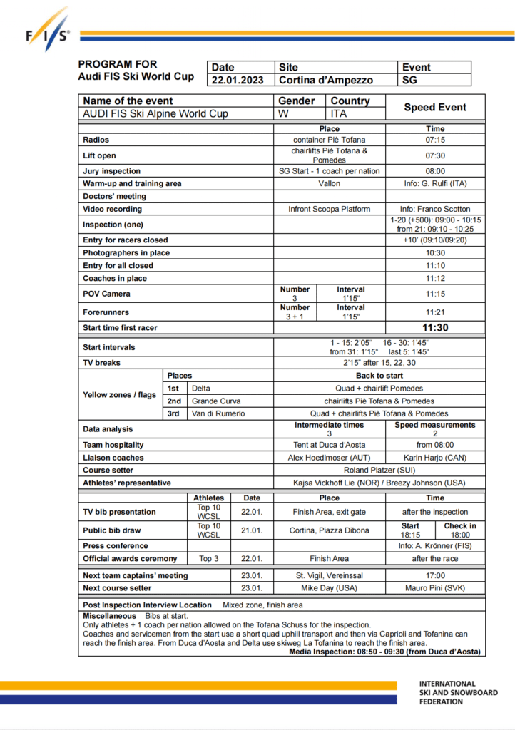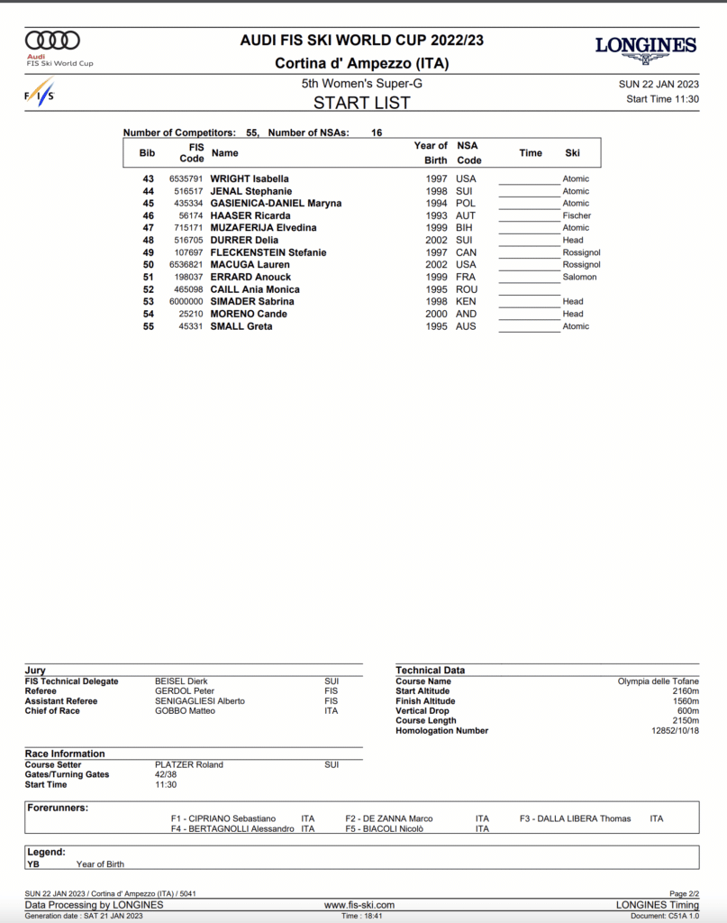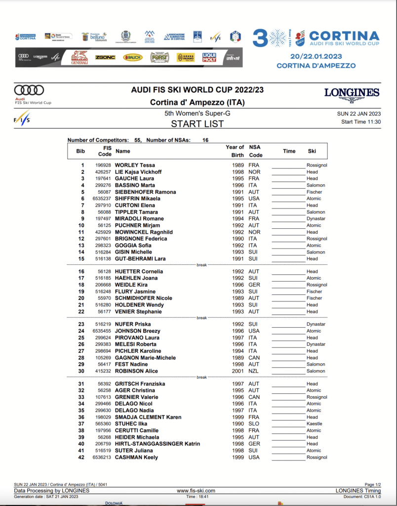 Start list and program for Saturday, January 22nd, Cortina super-G