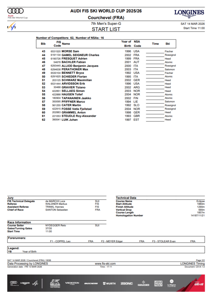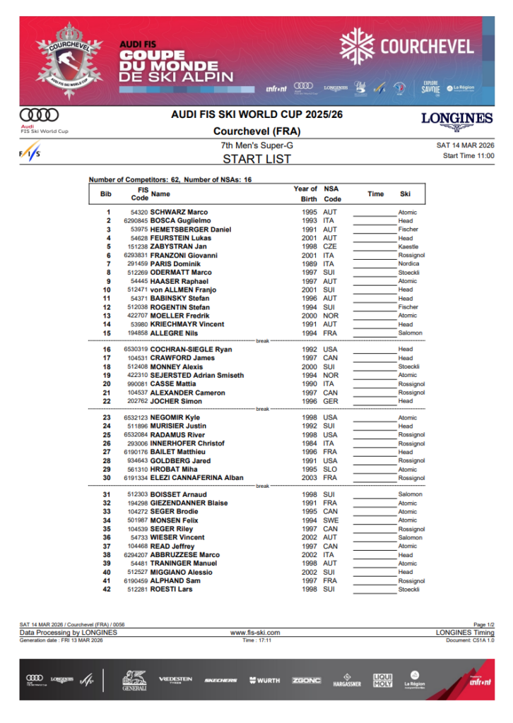 Men’s Super-G Start List