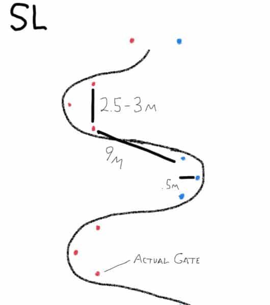 A GS turn shape course requires roughly double the measurements, sometimes even greater, compared to the SL course.
