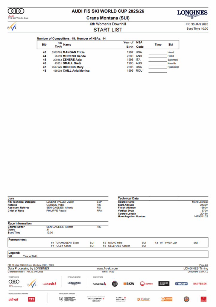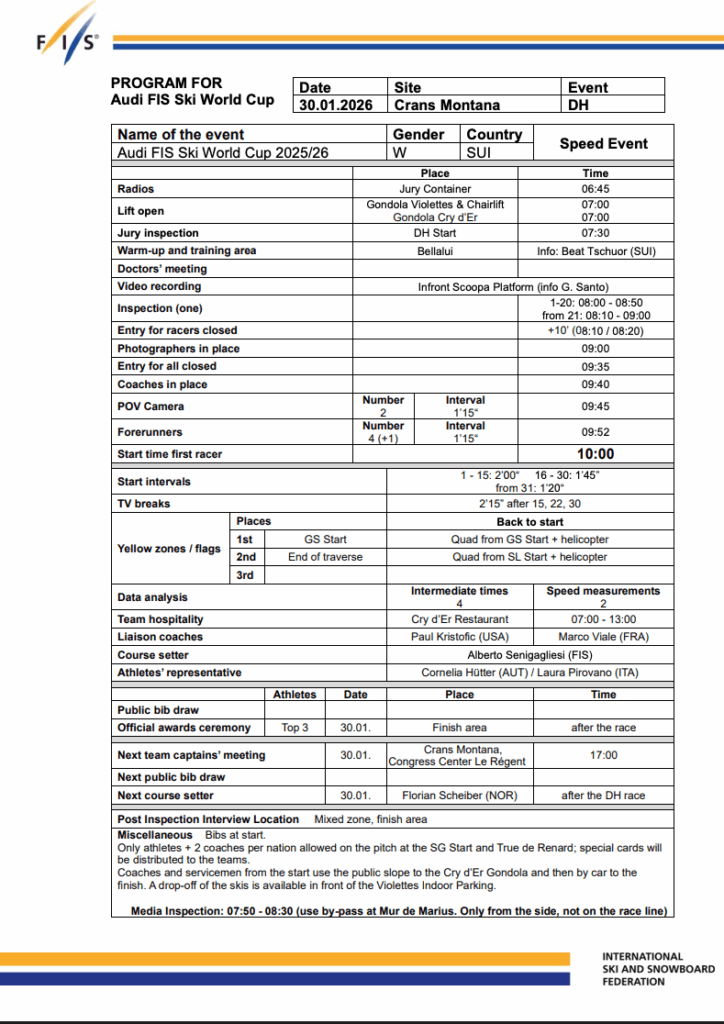 The women’s World Cup returns to Crans-Montana, Switzerland, for the sixth downhill of the 2025–26 season, racing on La Nationale — the same slope that will host the FIS Alpine World Ski Championships in 2027. With the Olympics looming and no more downhills before the Games, Friday’s race is not only a critical points stop, but the final competitive look at the Crans-Montana downhill before next season’s World Championships.