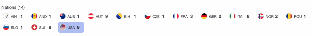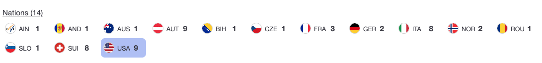 Through five races, four different women have won, and 10 different athletes have stood on the podium. Those podiums span five nations, led by the United States (6 podiums), followed by Austria (3), Germany (3), Italy (2), and Norway (1).