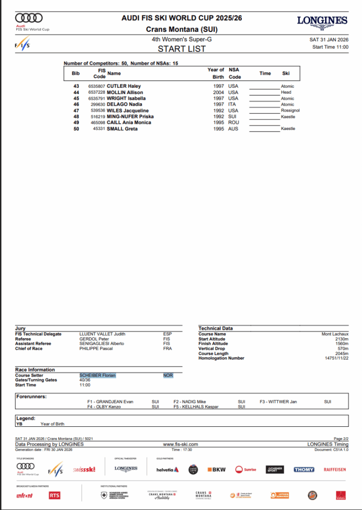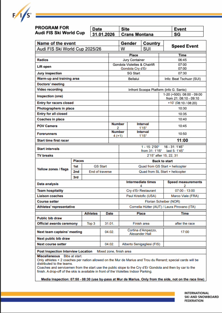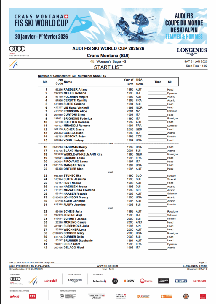 A notable subplot is Federica Brignone’s return to speed racing. This Super-G marks her first speed start since her injury and is her only speed race this season before the home Olympic Games in Cortina. That context adds extra weight to her presence on the start list, even in a discipline that has been difficult to interpret given the few races completed.