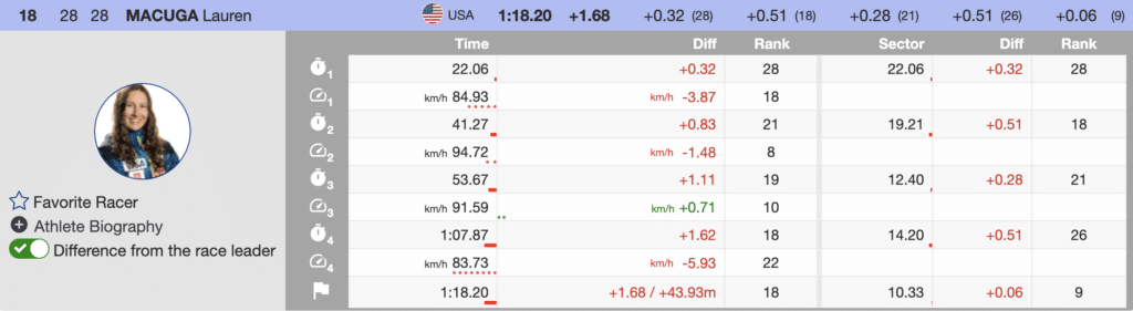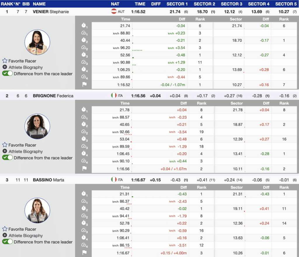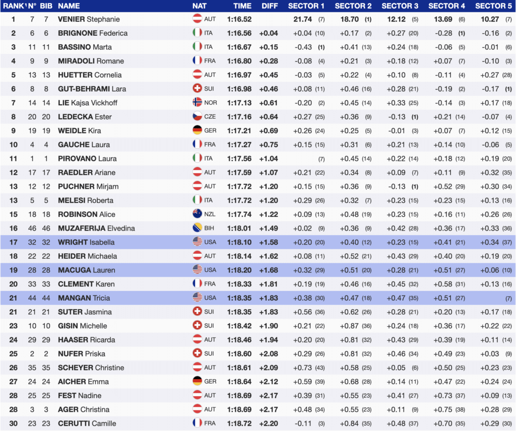 Yesterday’s Italian downhill winner, Marta Bassino, continued to impress. She was fast at the top and bottom of the course but lost time to Venier in the middle to finish 3rd (+0.15).