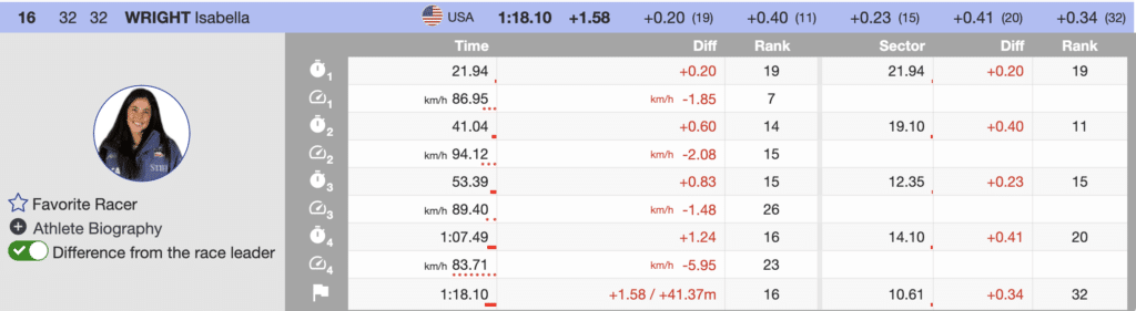 Next up was her teammate, Isabella Wright. She had a tough weekend with two disappointing downhills where she didn’t finish. But she channeled that energy into today’s super-G and achieved her career’s best, finishing 17th (+1.58). It’s been a frustrating year for the experienced skier, so hopefully, this result will set her up for a strong finish. She still has plenty of races left to improve her rankings.