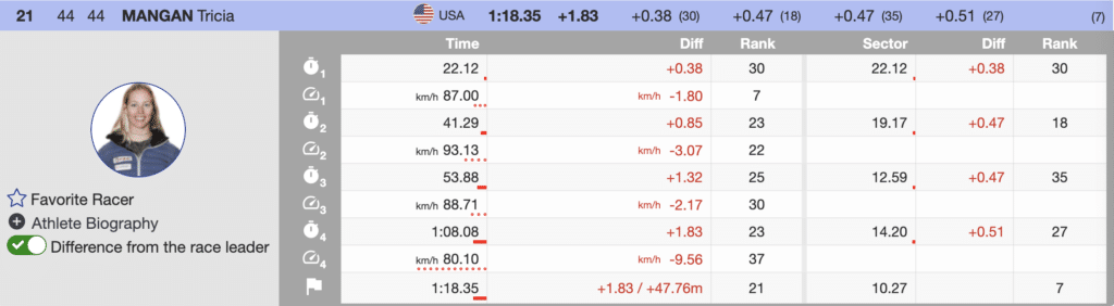 Today marked a significant milestone for their teammate, Tricia Mangan. She earned her first career super-G points, finishing 21st (+1.83). She had 23 previous World Cup super-G starts and she didn’t finish the last four. Scoring for the first time in any discipline is a big moment, and today, that special moment belonged to Mangan.