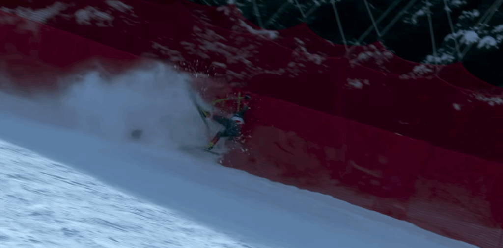 At approximately 119 km/h, his inside ski appeared to catch on the slightly bumpy surface while the outside ski continued on a straighter line, causing his body to rotate roughly 180 degrees.